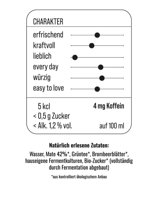 Wasser, Mate 42%*, Grüntee*, Brombeerblätter*, hauseigene Fermentkulturen,